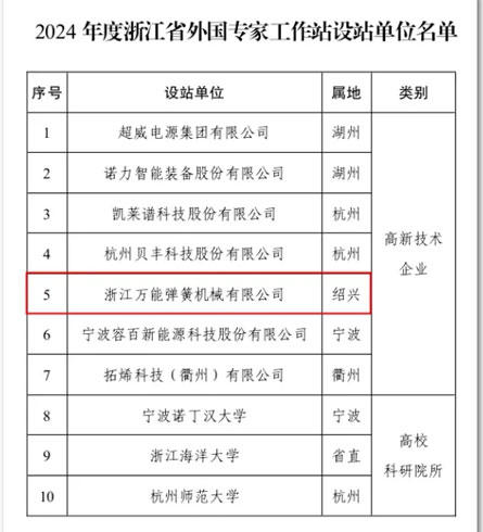 19th 12.2024 在全球化與科技創(chuàng)新的驅(qū)動(dòng)下,浙江省外國專家工作站成為吸引國際高端人才、推動(dòng)企業(yè)創(chuàng)新發(fā)展的重要平臺。自2020年《浙江省外國專家工作站管理辦法》實(shí)施以來,紹興市在吸引外籍專家方面取得了顯著成績。截至目前,紹興市已有6家單位獲批為省級外國專家工作站,位居全省前列。 2024年,浙江萬能彈簧機(jī)械有限公司榮...